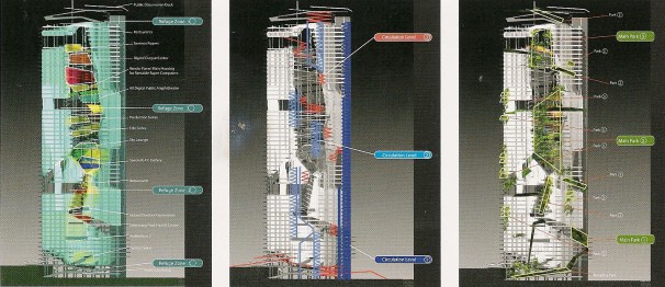 El programa consta de un, hotel, departamentos, oficinas, galerías de arte y todo lo que una ciudad urbanizada debería tener. Áreas vinculadas a través de sistemas verticales de movimiento, la gente se mueve en ascensores rápidamente de una zona a otra, mientras que las rampas y escaleras mecánicas permiten un movimiento más local. Los espacios públicos como terrazas ajardinadas y pistas de sky se incorporan en todas las plantas. La vegetación del parque fue diseñado para extenderse hacia arriba en todas las torres, es así que seria la creación de un único ecosistema continuo. Los parques de la planta, en la base inferior, contienen ecopuentes que van de este a oeste, ello para mantener la conectividad de la ecología de los sitios como las rutas de hábitat integral.