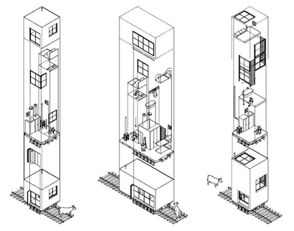 Esta habilidad de los módulos rodantes que contienen un hotel, un baño público y un hall de conciertos, les permiten conformar una escenografía urbana adecuada a cada actividad pública que pudiese acoger: mercados, conciertos, etc.