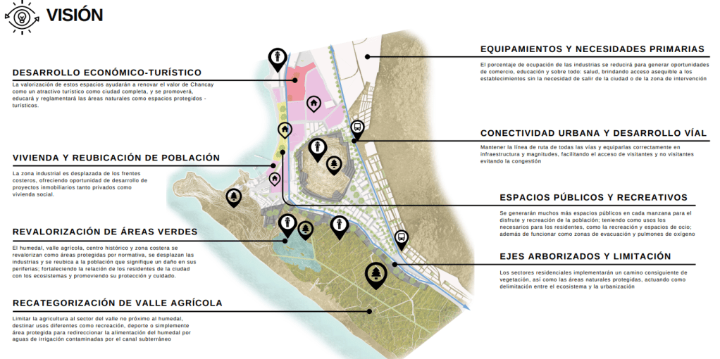 En este escenario, el desarrollo urbano de Chancay debe orientarse hacia un modelo más equitativo y sostenible. Resulta fundamental plantear una reconfiguración del tejido urbano que permita mitigar los efectos negativos derivados de la industrialización y la expansión urbana descontrolada. Esta reconfiguración debe sustentarse en la organización integral de los sistemas urbanos, diseñando a partir y en función de las áreas más críticas, de modo que el desarrollo y la calidad de vida no sean conceptos antagónicos, sino dimensiones complementarias de una misma visión territorial.
