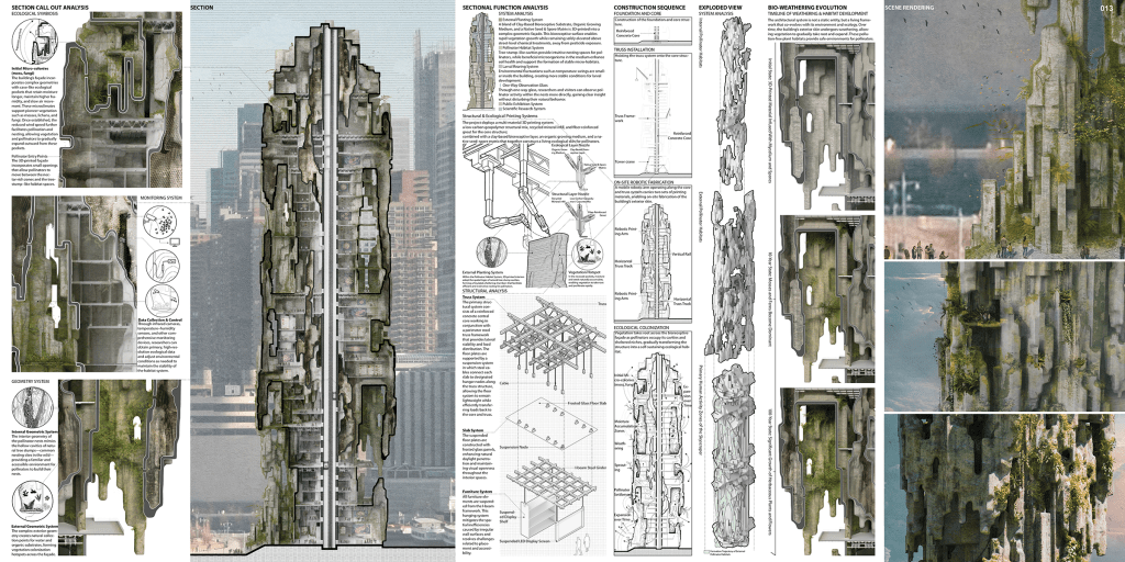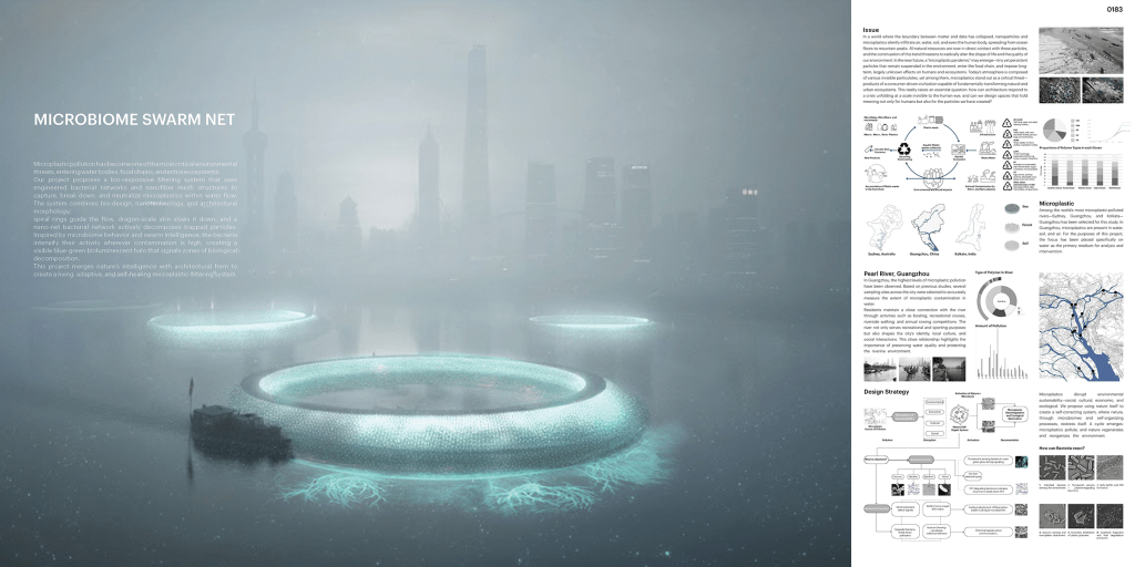 En The Living Refuge, la torre se transforma en un refugio ecológico capaz de reconstruir hábitats para especies polinizadoras dentro de uno de los contextos urbanos más densos del mundo. En el proyecto ubicado en Guangzhou, en cambio, la arquitectura se plantea como un sistema biológico de filtración capaz de interactuar con microorganismos para combatir la contaminación por microplásticos en los ríos urbanos.