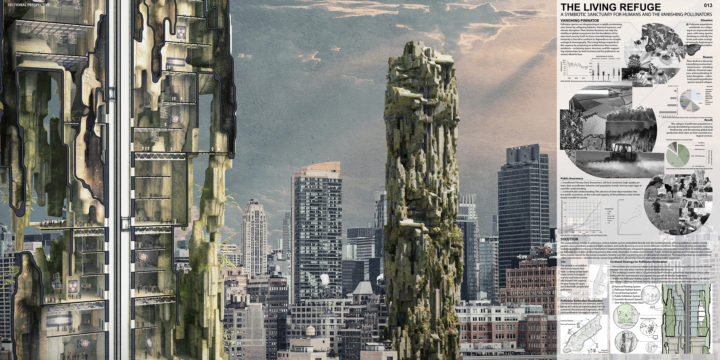 Frente a esta situación, la propuesta plantea una estrategia arquitectónica clara: transformar el rascacielos en un santuario vertical para polinizadores, elevando nuevos hábitats por encima del plano urbano contaminado.