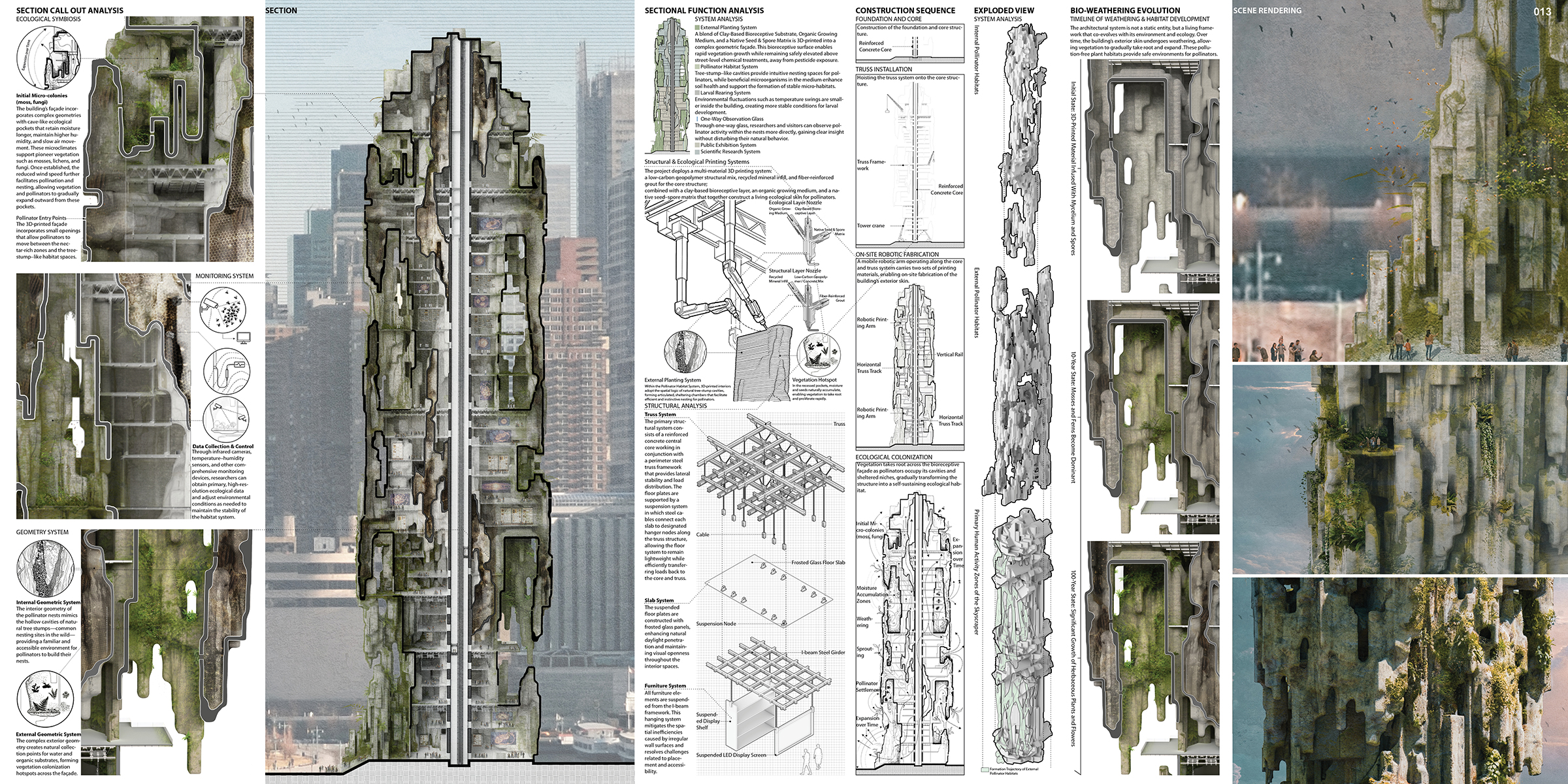 El elemento central del proyecto es una fachada producida mediante impresión 3D que funciona como un paisaje ecológico tridimensional. Un sistema robótico deposita dos tipos de materiales —uno estructural y otro ecológico— generando una superficie porosa capaz de retener humedad y materia orgánica. Esta geometría compleja crea microclimas protegidos donde pueden instalarse especies pioneras como musgos, líquenes y hongos.