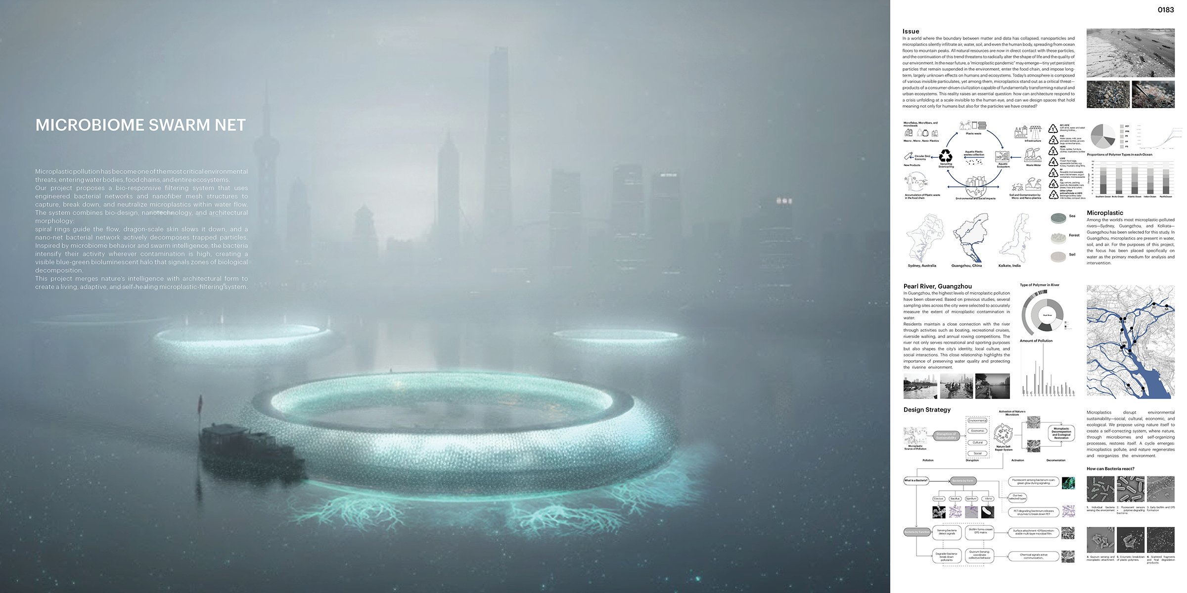 El proyecto se sitúa en Guangzhou, una metrópolis atravesada por uno de los ríos más contaminados de Asia. En este contexto, fragmentos microscópicos de plástico circulan continuamente a través del agua, penetrando en los ecosistemas acuáticos y escapando a los sistemas convencionales de filtración.