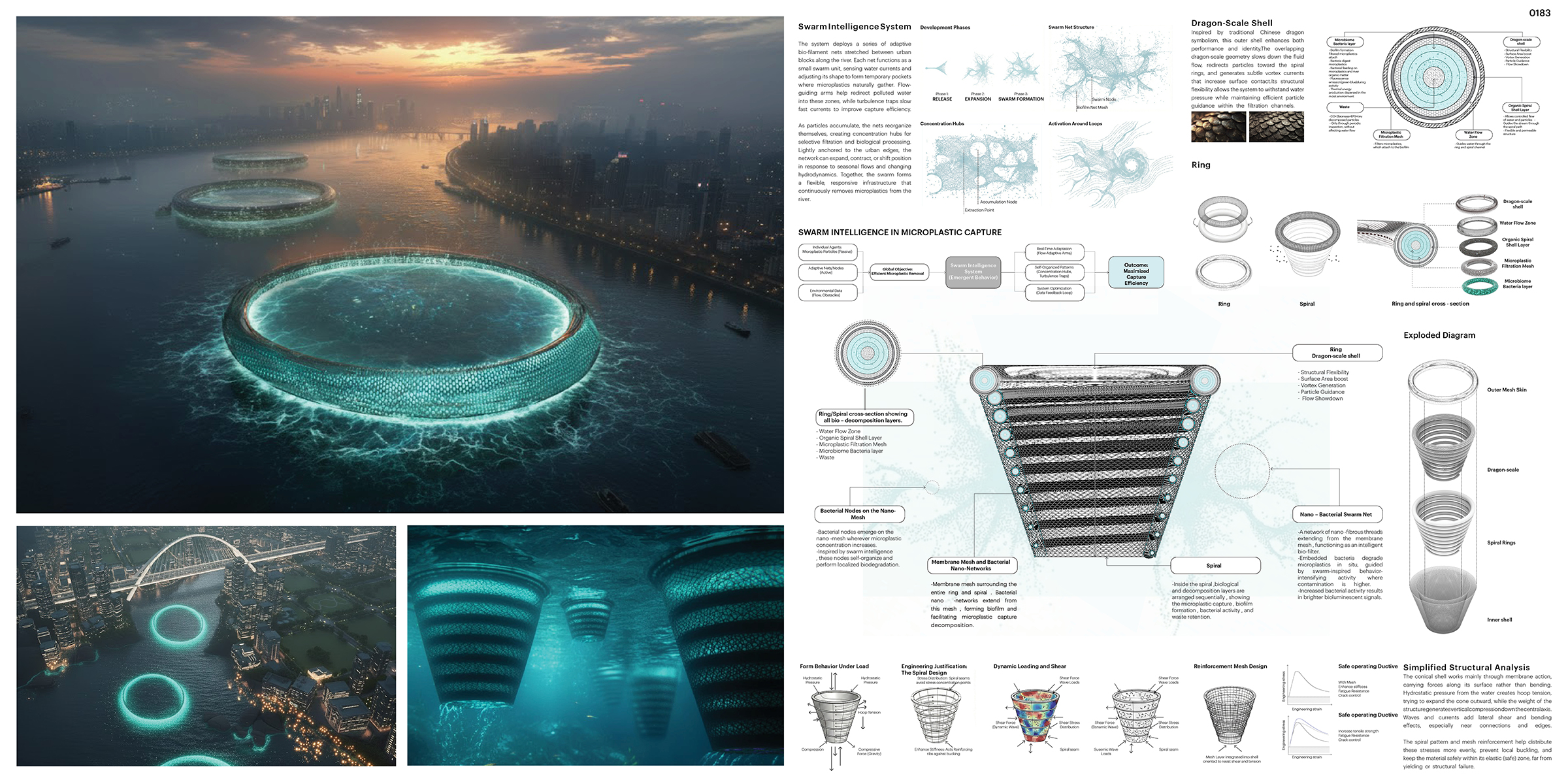 La estructura propuesta funciona como un sistema de purificación integrado al río. Su capa exterior, inspirada en las escamas del dragón presentes en la cultura china, ralentiza el flujo del agua y genera pequeños remolinos que dirigen las partículas contaminantes hacia el interior del sistema.