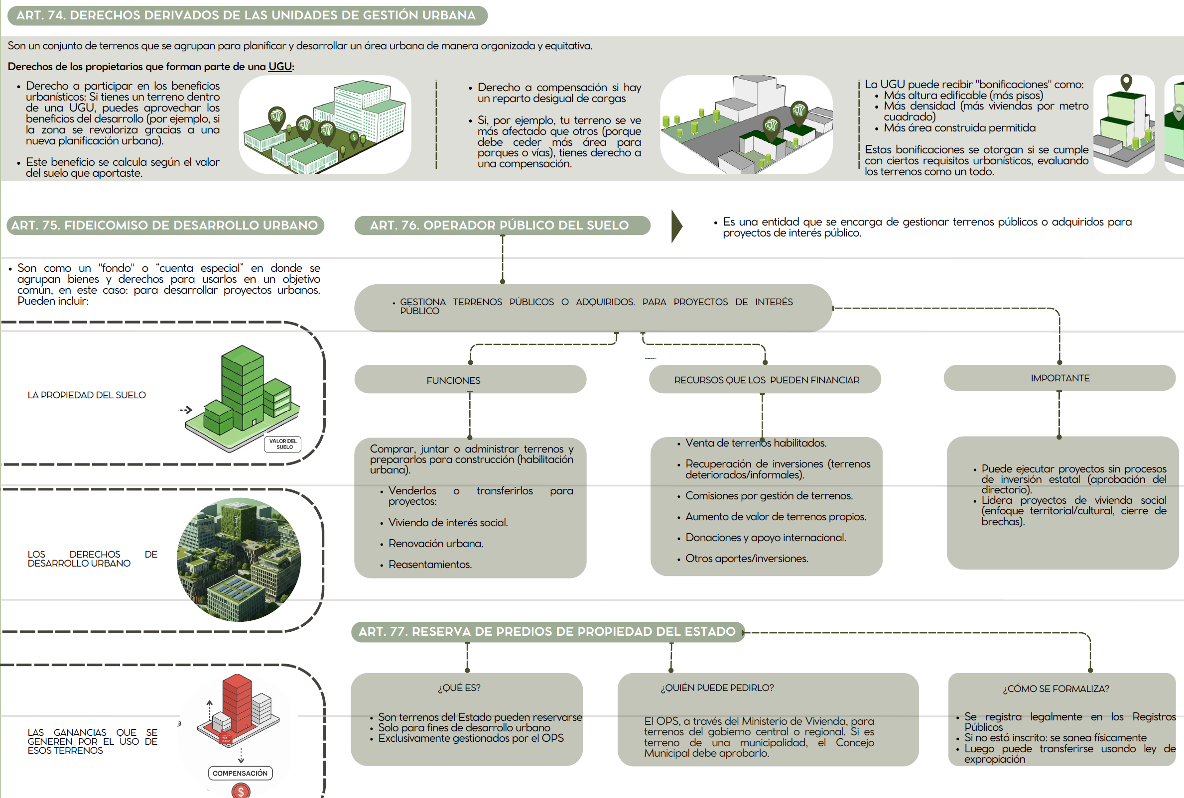 Instrumentos complementarios de gestión: renovación o regeneración urbana, unidades de gestión urbanística (UGU), fideicomiso de desarrollo urbano, operador público del suelo, reserva y transferencia de bienes inmuebles del Estado, inventario de suelos, banco de tierras.