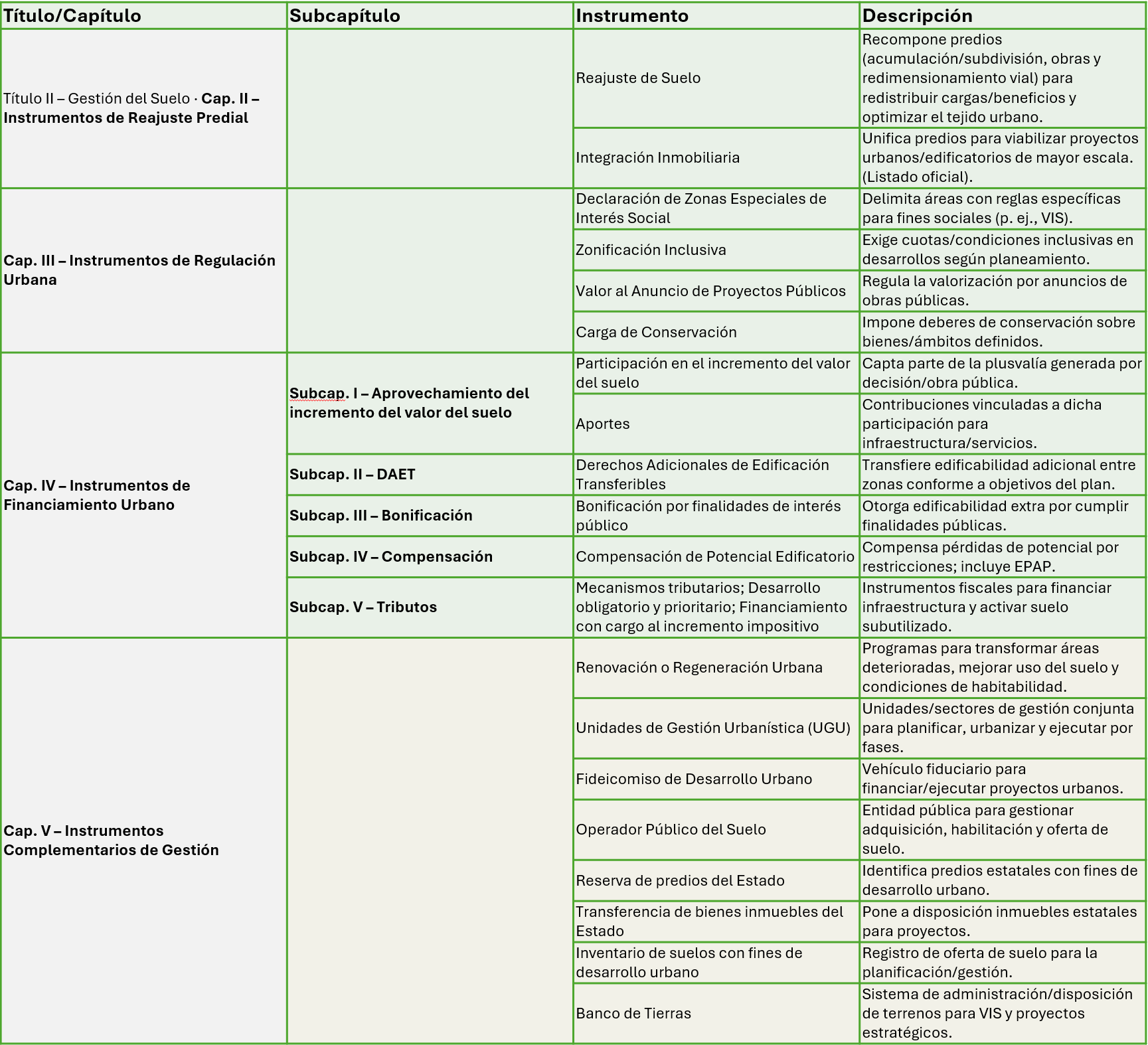Este apartado busca analizar la estructura y el funcionamiento de los distintos instrumentos de gestión urbana, no solo desde su viabilidad normativa, sino también desde su aplicación en el territorio. Se trata de confrontar la formulación jurídica —generalmente concebida en clave legal— con la mirada arquitectónica y urbanística sobre el espacio físico real. De esta manera, se pretende anticipar escenarios de implementación, identificar vacíos y proponer interpretaciones que acerquen la norma a la ciudad vivida.