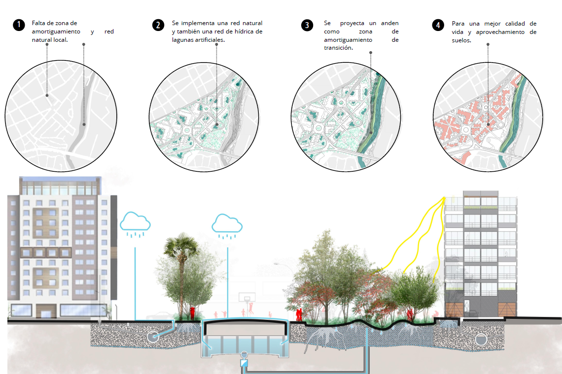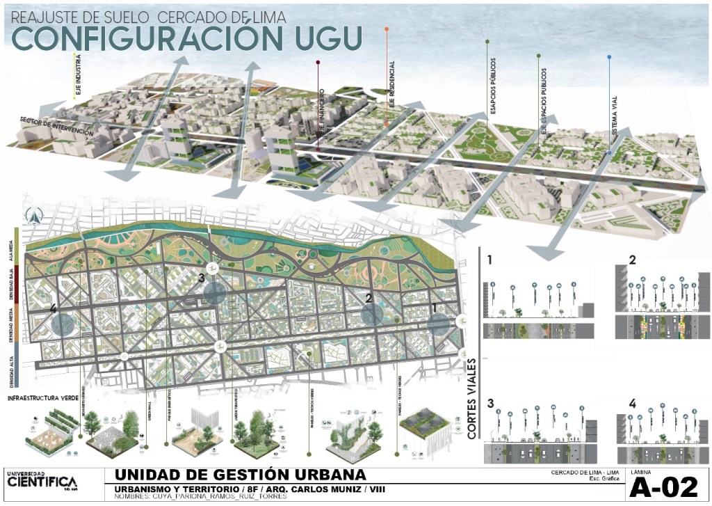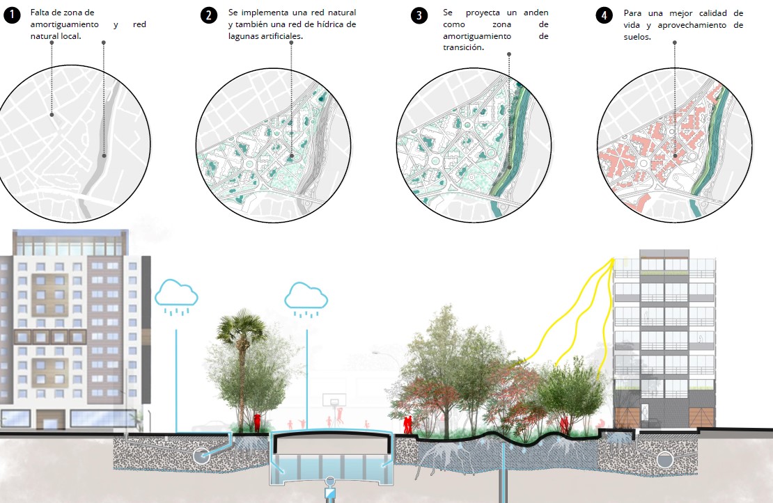 En esta zona de intervención hemos incorporado el concepto de Unidad de Gestión Urbana (UGU) en nuestras propuestas de reconfiguración urbana. Este enfoque ha sido clave para abordar procesos de gestión del suelo e introducir infraestructuras verdes y grises, con el objetivo de revitalizar áreas con una significativa influencia industrial.